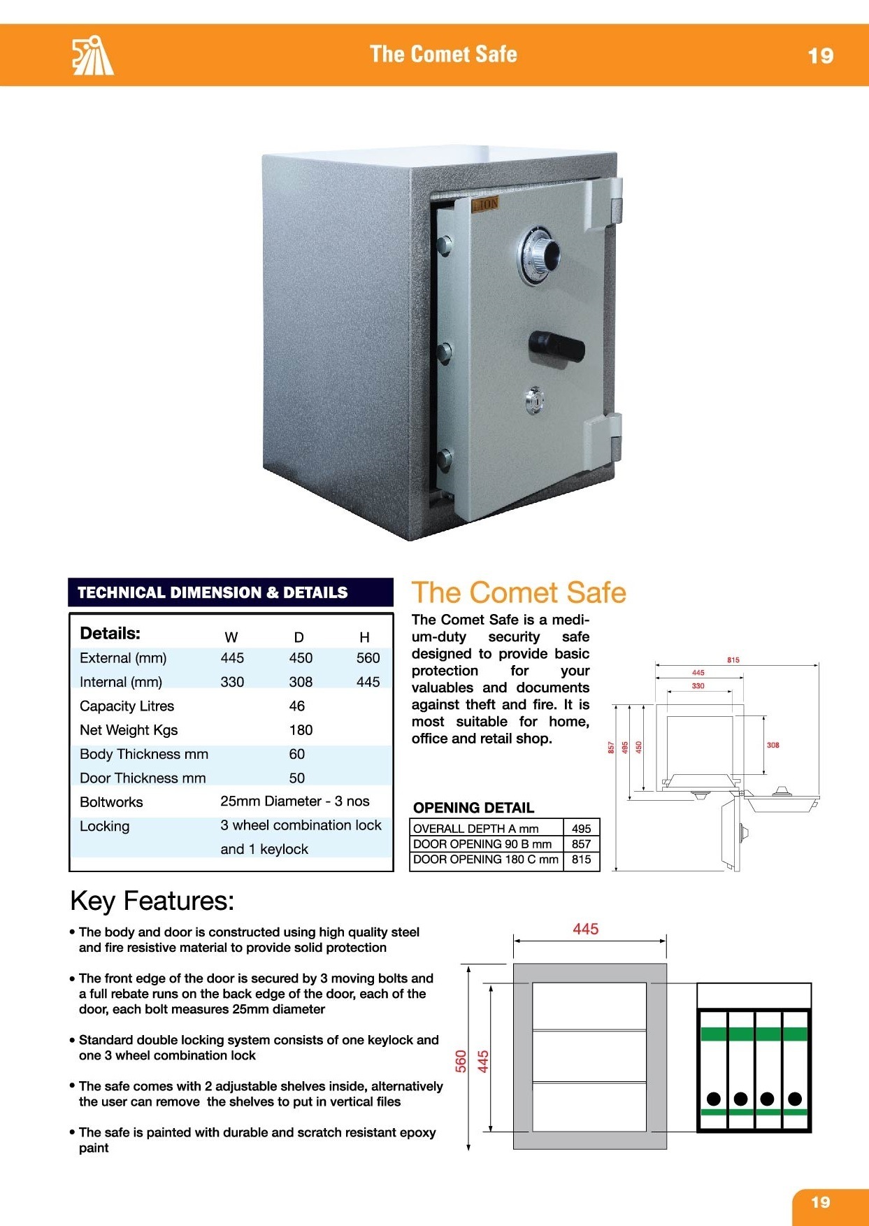 The Comet Safe is a medium-duty security safe designed to offer reliable protection for valuables and documents in homes, offices, and retail settings. Built with high-quality steel and fire-resistant materials, it features a solid 60mm body and 50mm thick door secured by a dual locking system with both key and 3-wheel combination lock.
