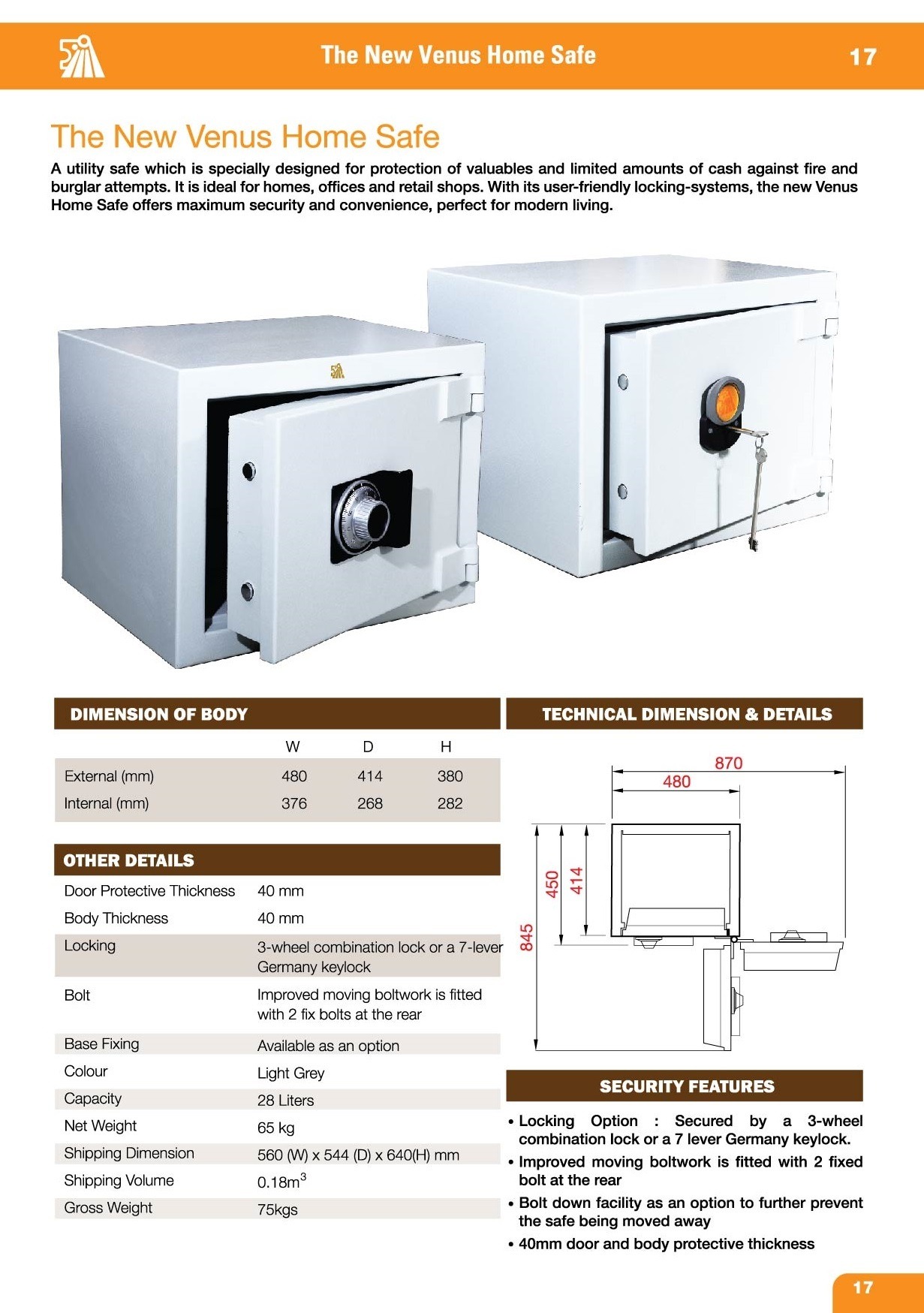 Each model is built with 40mm door and body thickness and filled with FM fire- and burglar-resistant material, providing effective resistance against tools, blowtorches, and forced entry. The improved moving boltwork is reinforced by two fixed rear bolts for added strength, and base fixing is available to prevent unauthorised removal.
